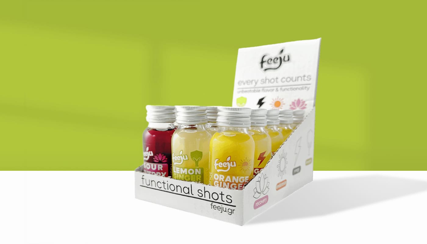 Με το Feeju Discovery Box παίρνεις σε ένα κουτί 15 functional shots με όλες τις γεύσεις: Ginger, Turmeric, Chilli & Sour Cherry.