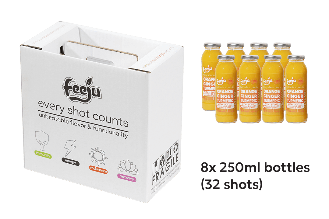 Orange – turmeric with a gingery twist and the earthy aftertaste of curcumin, enhanced by black pepper for better absorption. The combination of vitamins D3 (300% NRV*) and C (100% NRV*) helps maintain energy and stamina, reduces fatigue, and improves muscle function.
